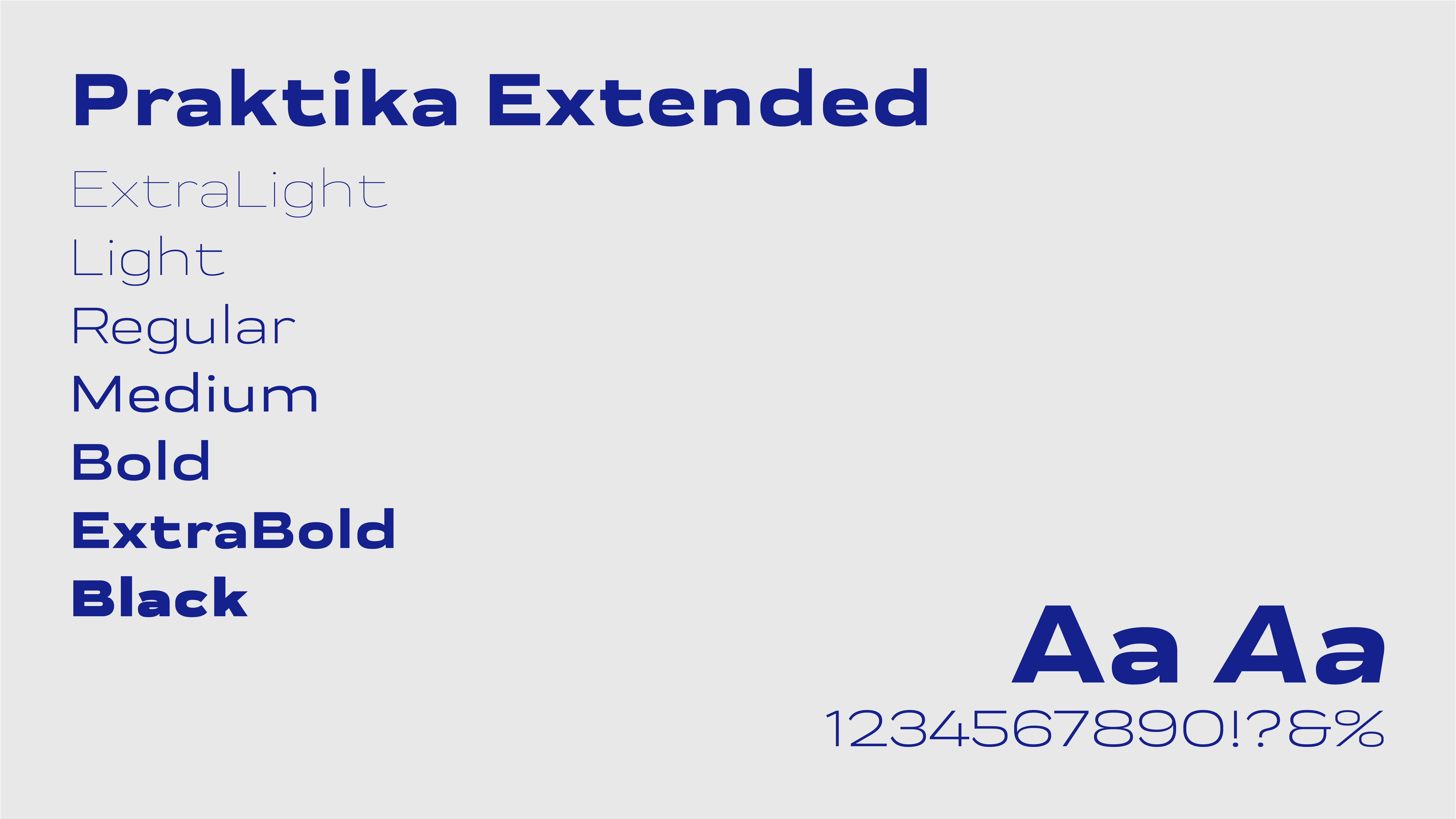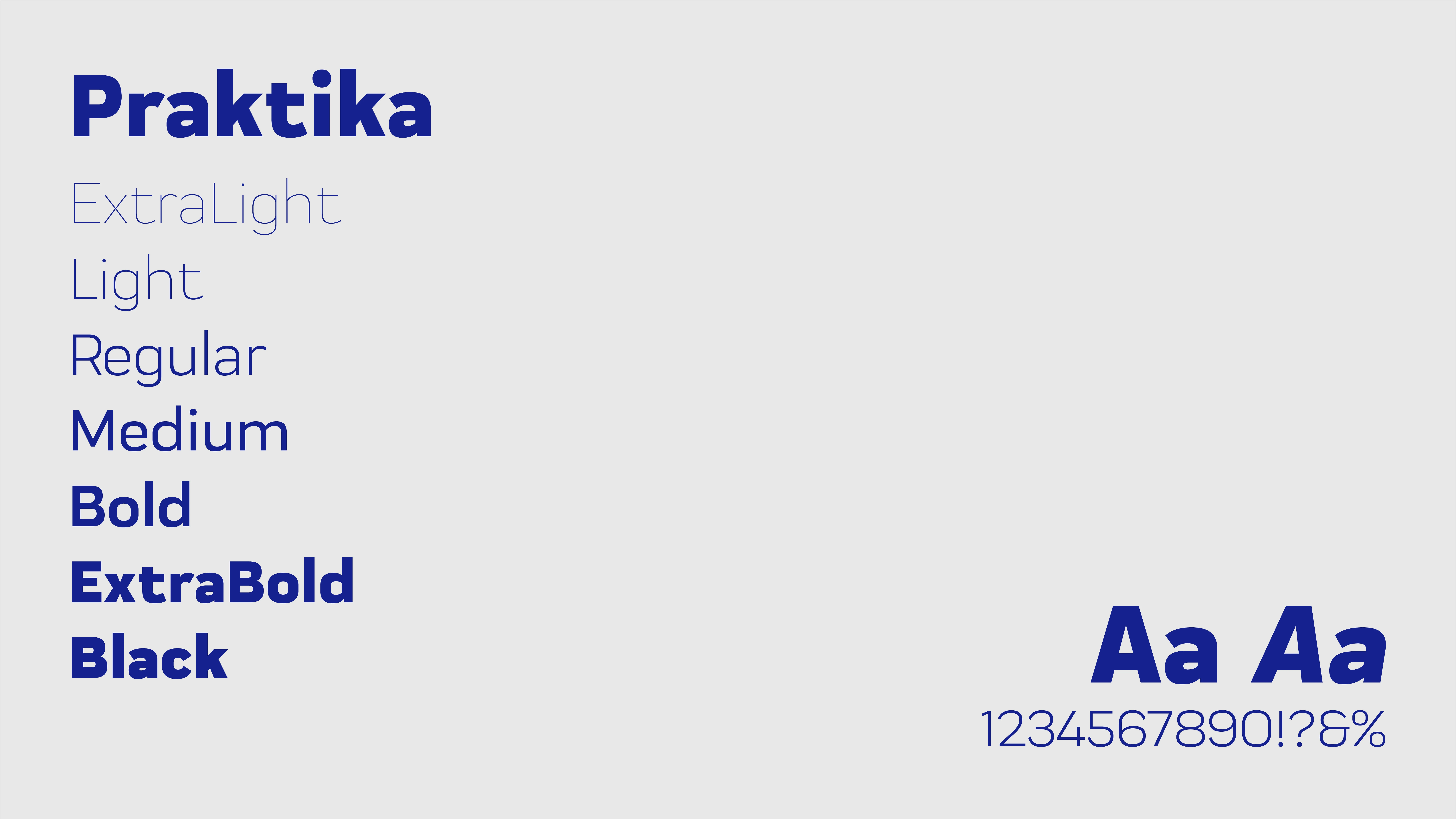 Praktika er en font som tilbys i 40 ulike vekter, og dermed gir stor variasjon i bruk. I logotypen er den satt i Extrabold Extended, mens i brødtekst brukes den som regular. Den er utviklet av Fenotype og kan lisensieres hos My Fonts.